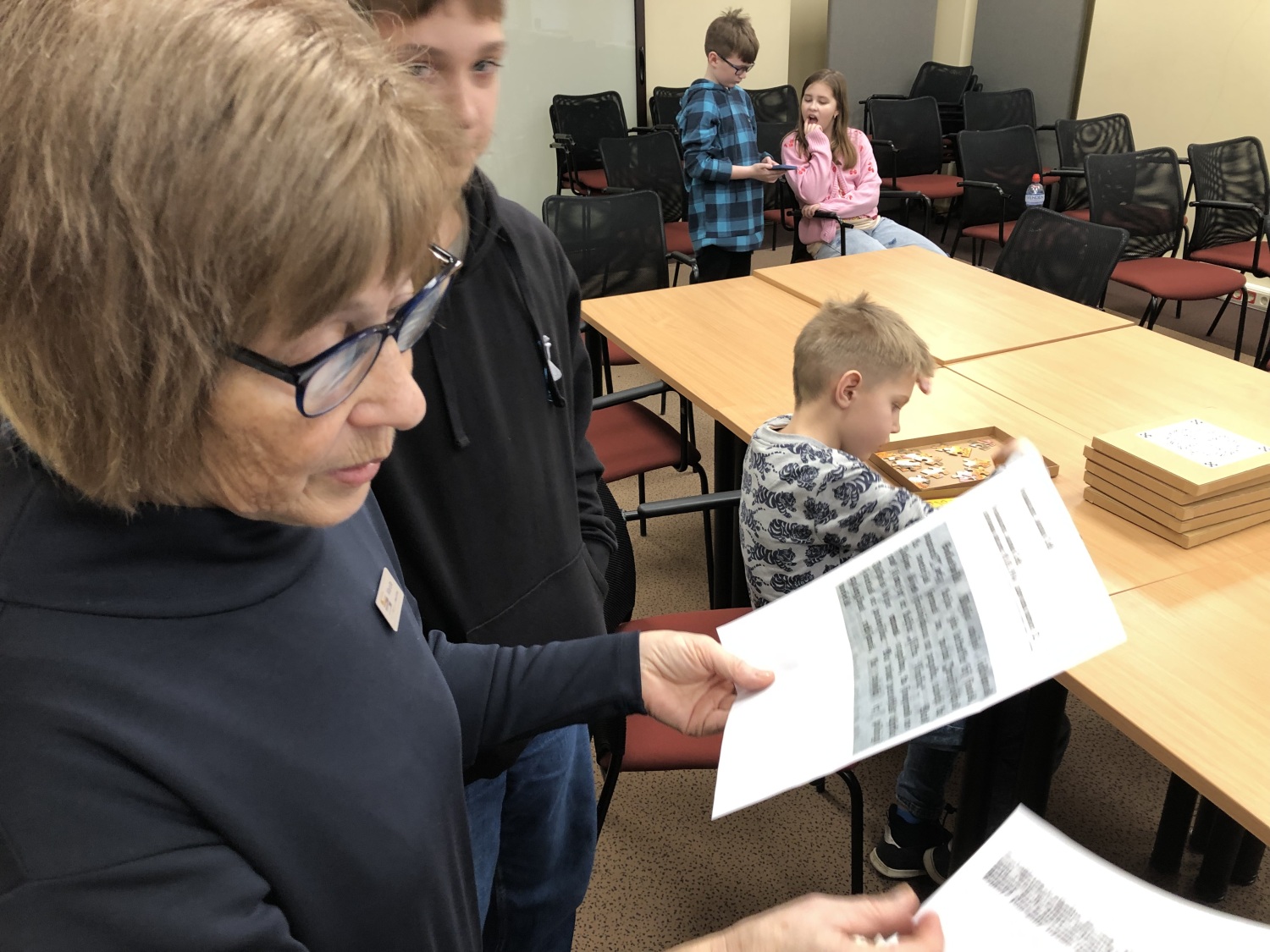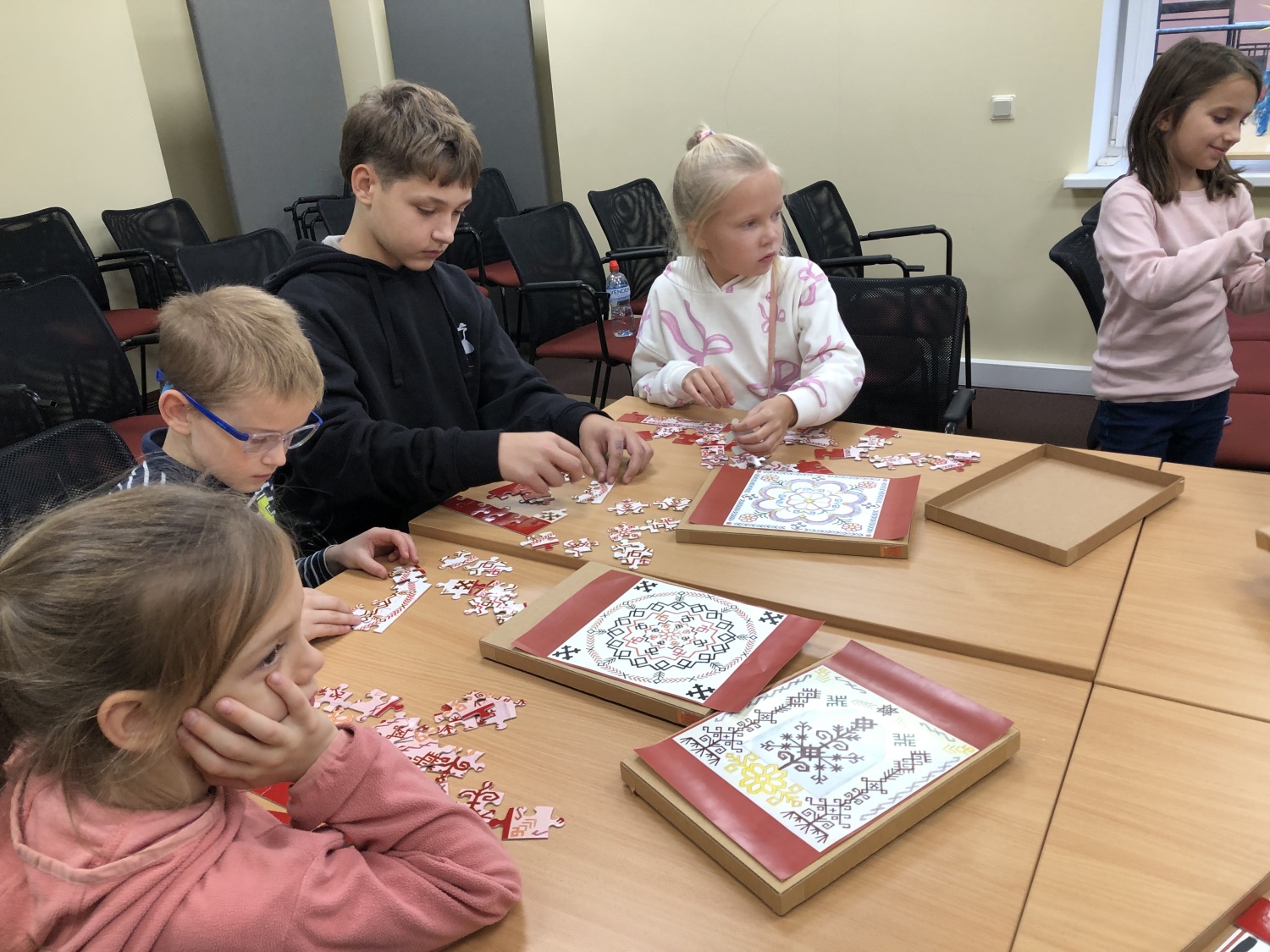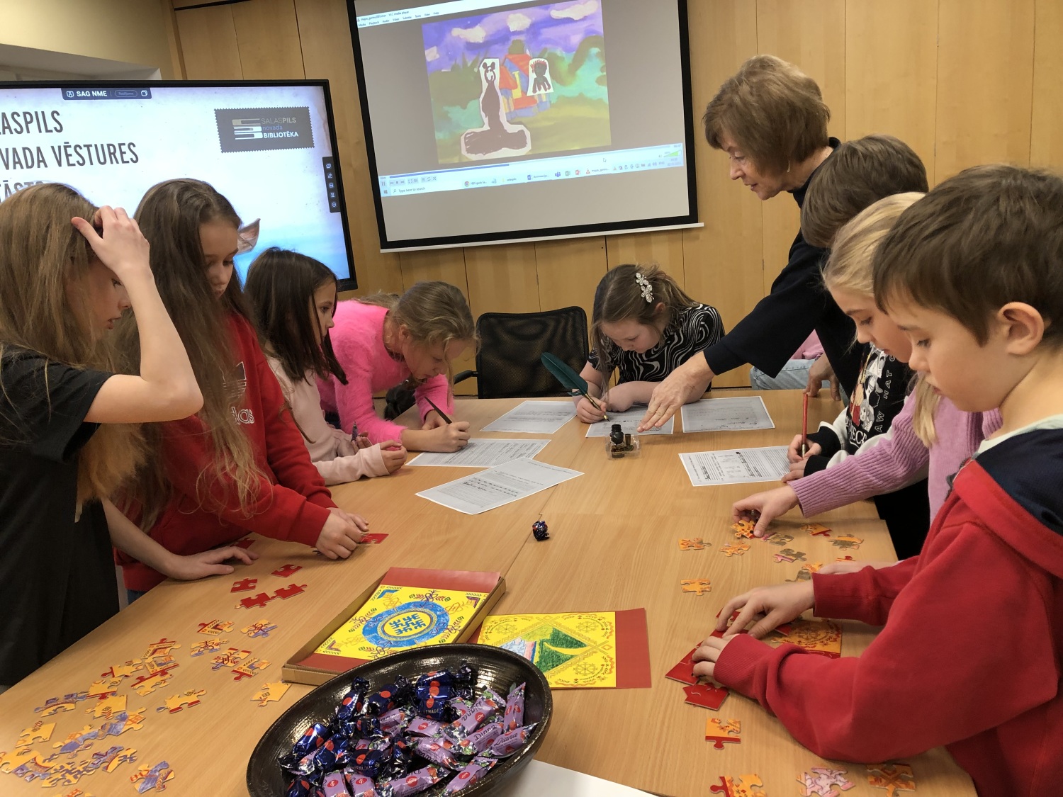 bibliotekāru iedotās puzles ar latviešu zīmēm mudināja bērnus izpētīt senos simbolus, to nozīmi un saikni ar mūsdienām;