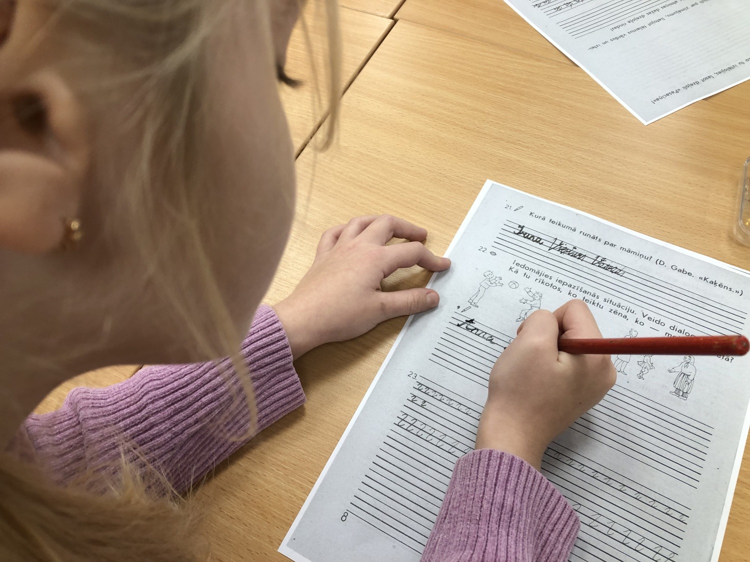 skolēni centās izlasīt rakstu, kas veidots vecajā drukā, pirms tika ieviesta pašreizējā rakstība.