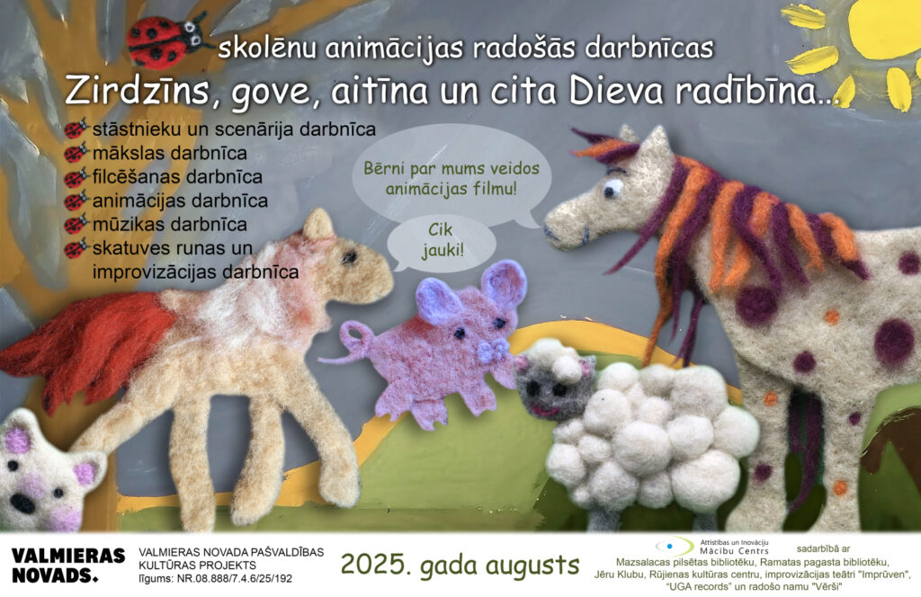 Pēc tam mākslas darbnīcā gleznosim filmas fonus un filcēšanas darbnīcās izveidosim animācijas personāžus. Mūzikas/skaņu, improvizācijas un skatuves runas darbnīcās mācīsimies ieklausīties, stāstīt, dziedāt un muzicēt, lai radītu filmas skanošo daļu. Skaņu ierakstu studijā “UGA records” ierunāsim animācijas filmu Mazsalacas “mēlē”. Animācijas darbnīcās filmēsim animācijas epizodes un beigās visu saliksim kopā, tā izveidojot animācijas filmu “Zirdzīns, gove, aitīna un cita Dieva radībīna”. Lai nebūtu nogurdinoši, darbnīcām pa vidu uzspēlēsim kādu spēli vai rotaļu ar kustību elementiem un protams DRAUDZĒSIMIES un izbaudīsim vasaru.